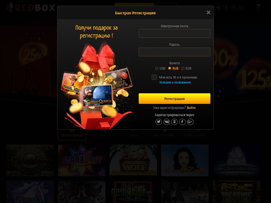 Расчетной валютой в Red Box является доллар США, но также можно играть на рубли и евро. Также принимаются биткойны.