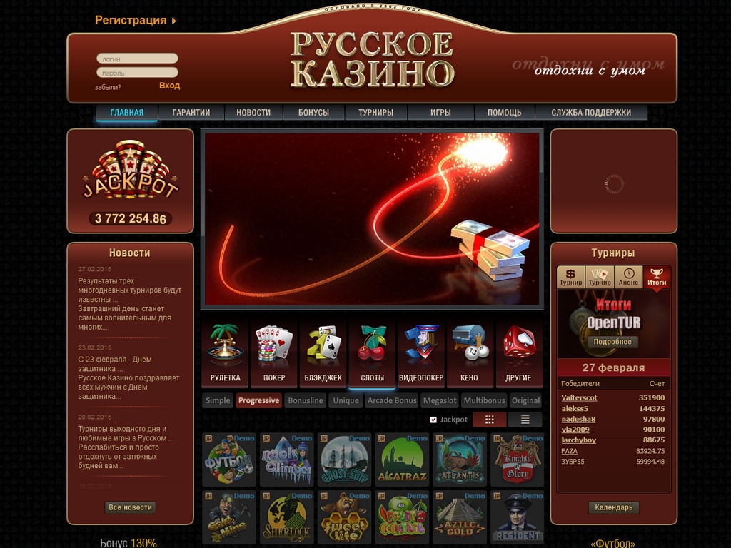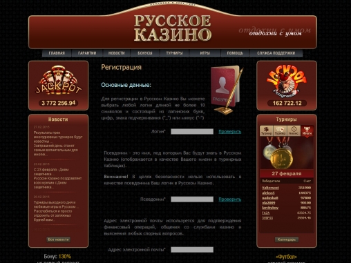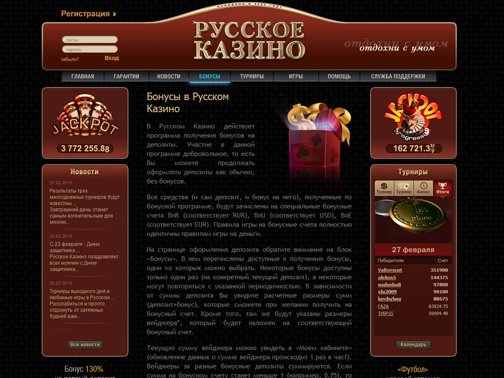 рейтинги игроков. Интригующий призыв – отдохни с умом, расположенный в углу главной страницы, вызывает желание начать игру и настраивает на приятное времяпрепровождение. Сразу видно, что дизайнеры постарались на славу, разрабатывая интерьер казино Русское.
