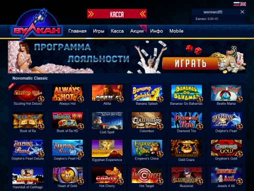 Основную массу моделей в ассортименте «Вулкана» составляют игровые автоматы Novomatic, Novomatic Deluxe, Aristocrat и Igrosoft. Также доступны десятки слотов производства Playtech и Net Entertainment.