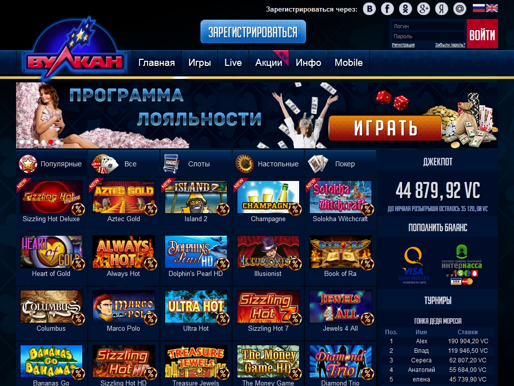 Солидная подборка игр нескольких известных производителей, впечатляющая бонусная программа, наличие других поощрительных акций, регулярные турниры, русскоязычный интерфейс, возможность играть на рубли, поддержка распространенных платежных систем – все это, несомненно, говорит в пользу казино-клуба «Вулкан».