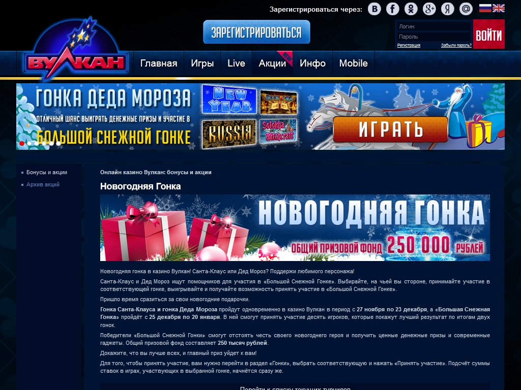 Сайт оформлен в фирменных сине-красных цветах, типичных для всех заведений под вывеской «Вулкан». Прямо на главной странице посетитель видит логотипы предлагаемых игр. Здесь же доступны баннеры с рекламой бонусов, турниров и акций, информация о джекпотах и другие важные данные. Разделы меню логичные и понятные, так что проблем с навигацией не будет. Общее впечатление от дизайна и структуры положительное.