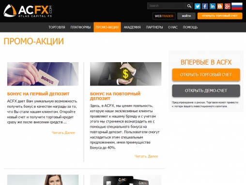Своим трейдерам компания ACFX предлагает несколько видов форекс бонусов, одни из которых выдаются за пополнение торгового счета, а другие за привлечение новых в клиентов.
