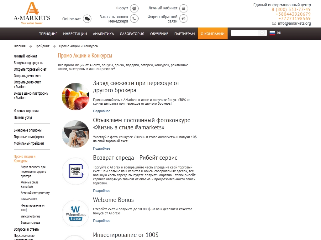 Брокер А форекс известен достаточно длительное время и зарекомендовал себя как перспективный и активно развивающийся. Очень положительные характеристики - это бонусы, кредитное плечо и онлайн - обучение на сайте, где представлены учебные материалы