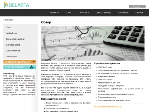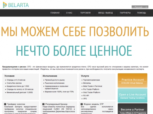 Belarta предлагает всем трейдерам воспользоваться своими услугами, где минимальный плавающий спред равен 0,3 пипса. Кроме того все клиенты брокера могут выбрать одну из четырех торговых платформ для торговли на мировых рынках, в том числе валютном Форекс. Среди других преимуществ следует выделить технологию STP, многоязыковую круглосуточную поддержку, алгоритмический трейдинг, большой выбор продуктов для торговли и, конечно же, сегрегация счетов, ведь брокер является членом Investor Compensation Fund (Компенсационный фонд инвесторов).