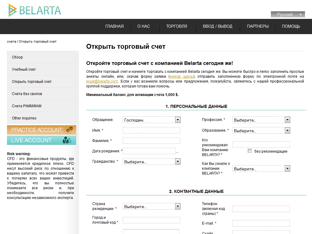 Клиенты форекс брокера Belarta имеют возможность открыть один из нескольких счетов, но для этого потребуется заполнить заявление, отправить сотрудникам компании, а далее подтвердить соответствующими документами свою личность и место проживания, загрузив их на сайте компании.