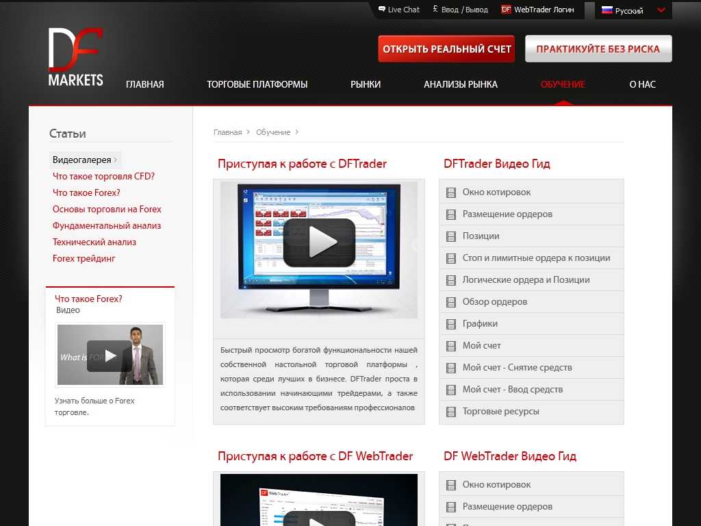 DF Markets дает возможность всем пользователям пройти онлайн обучение торговле на валютном рынке Форекс при помощи опубликованных материалов на сайте брокера.