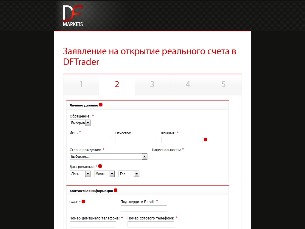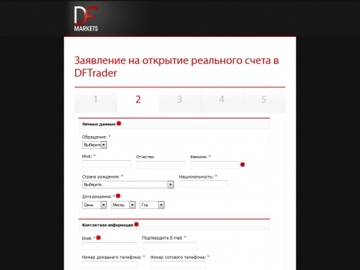 Чтобы открыть торговый счет у брокера DF Markets, следует заполнить заявление на его сайте и отправить сотрудникам компании, которые после рассмотрения оного свяжутся с клиентом и предложат один из нескольких видов счетов, исходя из потребностей трейдера.