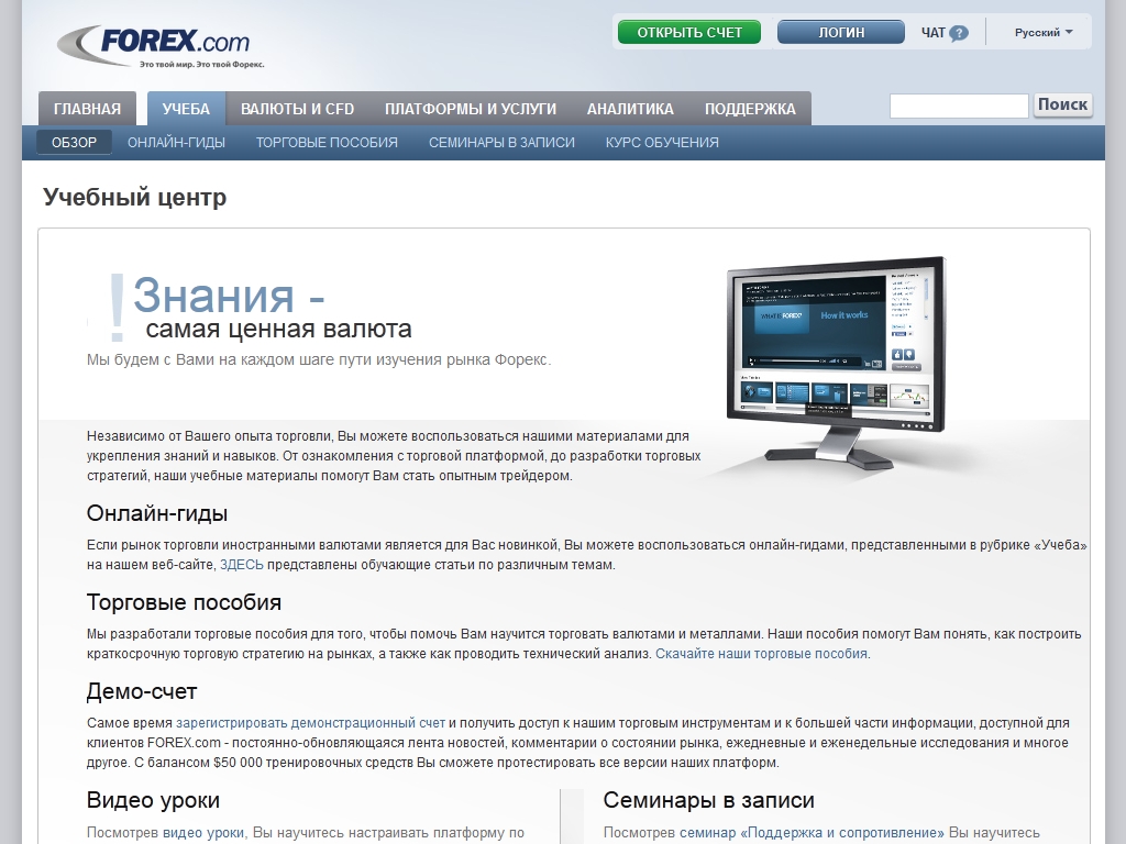 FOREX.com предлагает всем пользователям большое количество обучающих материалов, которые размещены на его сайте. Среди обучающих материалов есть бесплатные онлайн-гиды, семинары в записи, видео-уроки, а также можно заказать платный курс обучения, состоящий из семи уроков.