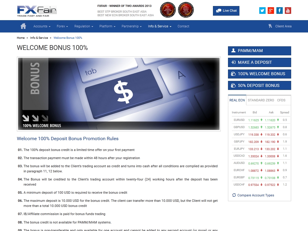 В настоящее время на сайте FXFair проводится только одна акция, направленная на новых клиентов, и позволяющая им получить форекс бонус на первый депозит.