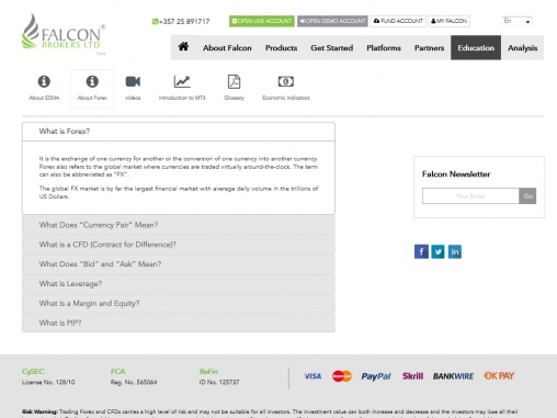 На сайте Falcon Brokers начинающие трейдеры могут пройти бесплатное обучение торговле на международном валютном рынке Forex при помощи многочисленных материалов, опубликованных на нем.