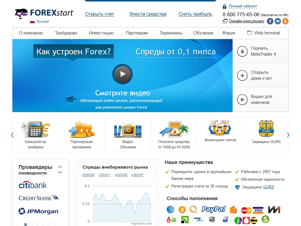 Форекс Старт сотрудничает с крупнейшими маркет-мейкерами, среди которых швейцарские банки (Credit Suisse, UBS), финансовые компании (JPMorgan Chase, Citigroup, Barclays Plc.) и коммерческие банки (Goldman Sachs), именно поэтому брокер может гарантировать своим клиентам одни из самых выгодных условий торговли на рынке Forex.
