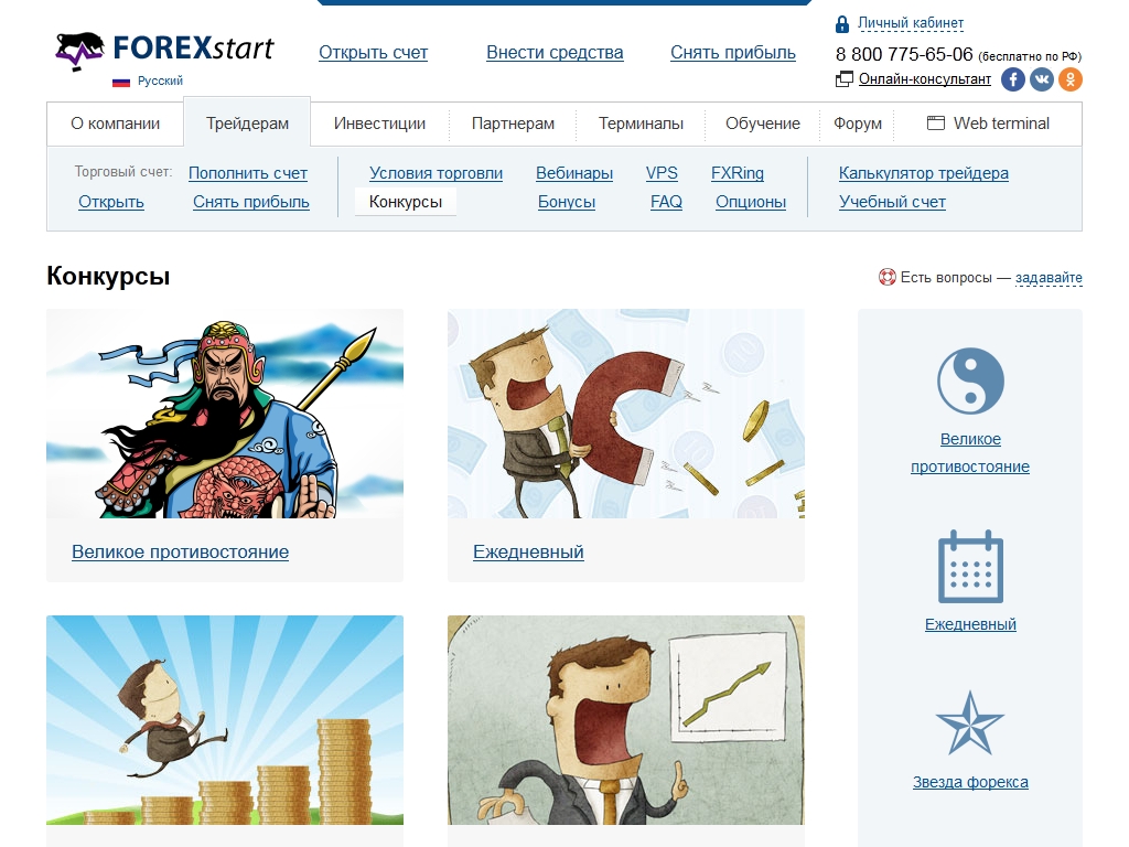 Брокер заинтересован в своем дальнейшем развитии, и всегда рад новым клиентам, решившим начать торговлю на валютном рынке, поэтому на его интернет-площадке большое количество обучающих материалов для начинающих трейдеров, помощь специалистов через онлайн-чат по всем вопросам, и, конечно же, конкурс «Звезда Форекса», позволяющий выиграть хорошие денежные призы.