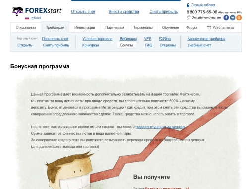 Несмотря на то, что Forex Start в данный момент не предлагает форекс бонусы своим клиентам за пополнение торгового счета, он все же радует трейдеров возможностью получить бесплатные денежные средства. Каждый клиент брокера может принять участие в конкурсе «Звезда Форекса», который проводится еженедельно. Участники конкурса получают на демо-счет 5000 долларов, и как только дан старт, начинают торговать на валютном рынке. По итогам недели три лучших форекс трейдера, которые показали наибольшую прибыль на своих счетах, получают вознаграждение от брокера.