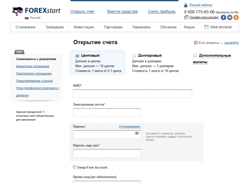 Брокер Forex Start предлагает следующие условия торговли для трейдеров: