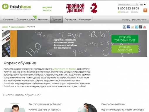 FreshForex дает возможность всем пользователям пройти бесплатное обучение по торговле на валютном рынке Форекс на основе предложенных материалов, а клиенты брокера могут записаться на бесплатные курсы, которые проводятся регулярно.