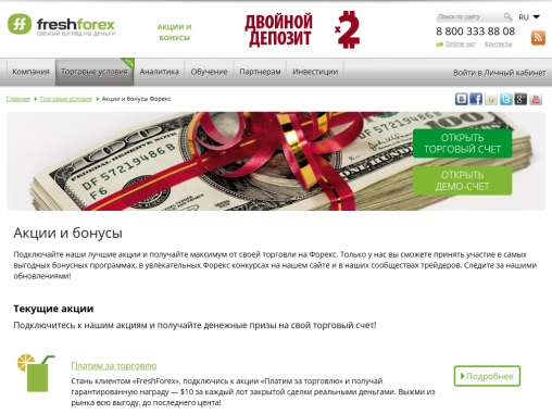 FreshForex проводит на своей интернет-площадке большое количество разнообразных акций и конкурсов, которые постоянно обновляются и позволяют форекс трейдерам получать различные форекс бонусы от брокера.