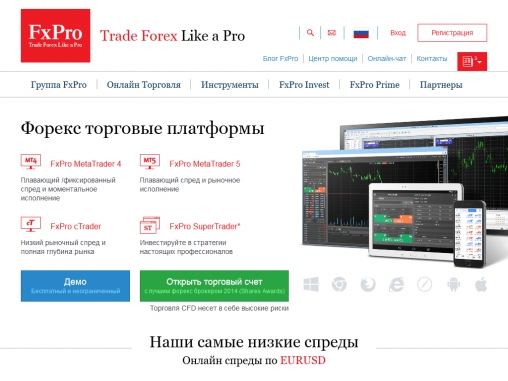 FxPRO-Forex предлагает своим трейдерам валютные котировки от мировых банков (Morgan Stanley, Deutsche Bank, UBS и т. д.) в режиме реального времени, исполнение ордеров происходит в кратчайшие сроки, а спреды являются достаточно низкими.