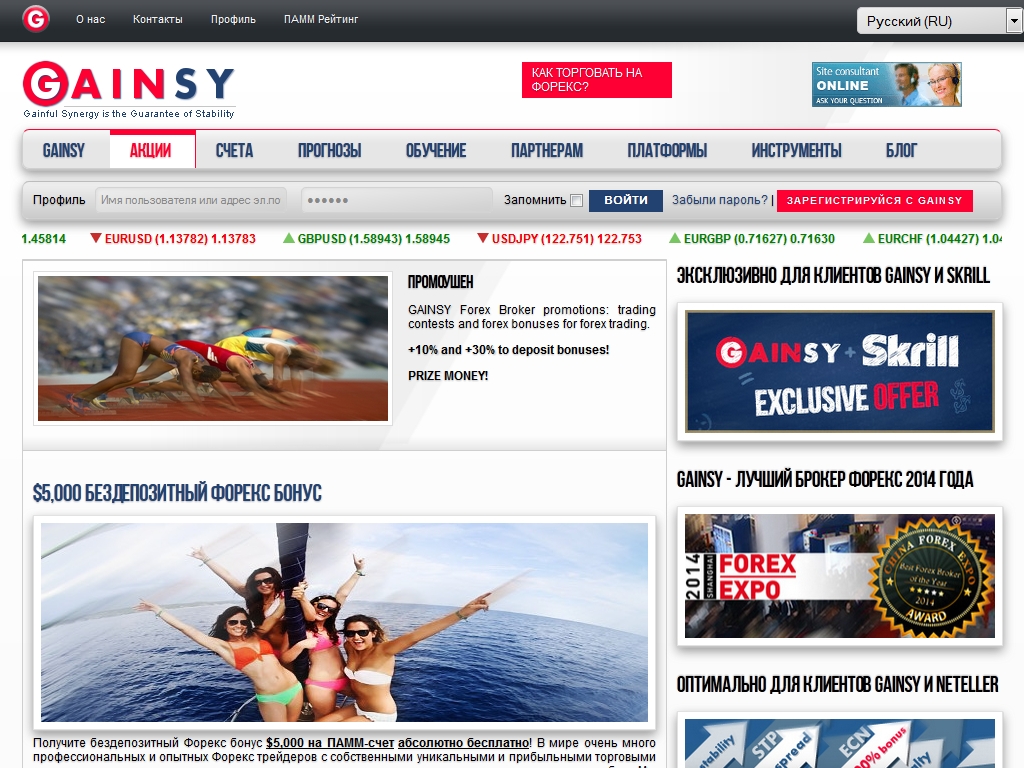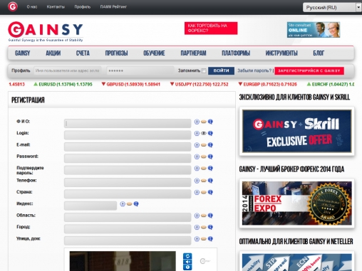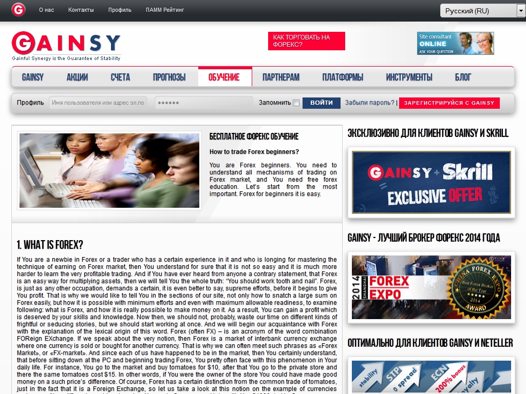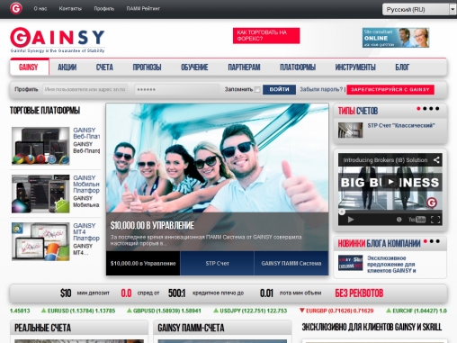 Сайт брокера доступен на многих языкам мира, что позволяет трейдерам получать всю необходимую информацию на родном языке. Клиенты GAINSY могут пройти бесплатное обучение торговле на валютном рынке, и протестировать свои способности на демо-счете.