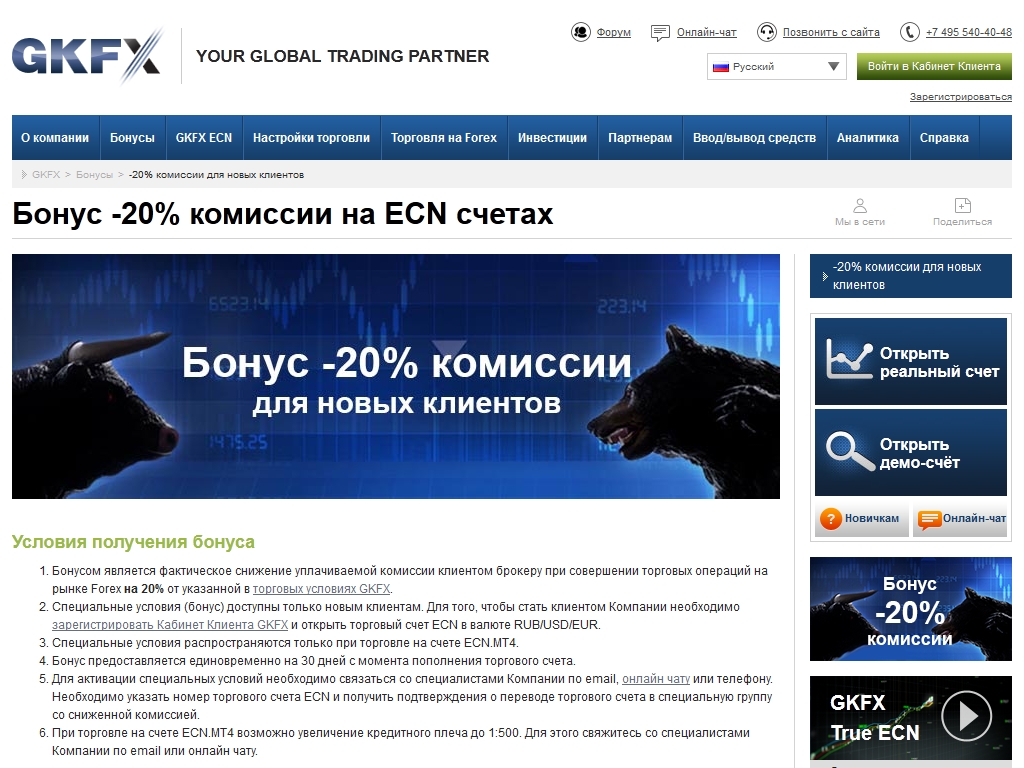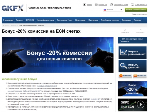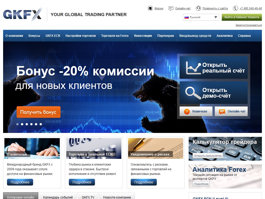 Брокер предлагает всем пользователям воспользоваться бесплатными учебными материалами по торговле на валютном рынке, опубликованными на его сайте. А для своих клиентов GKFX проводит разнообразные конкурсы, в которых они могут выиграть приличные форекс бонусы, заняв призовые места.