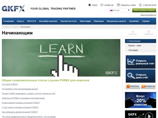 На сайте GKFX доступны для изучения обучающие материалы, позволяющие получить базовые знания о том, как торговать на валютном рынке и фондовых биржах.