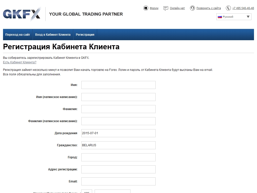 GKFX оказывает всестороннюю поддержку своим клиентам в будние дни с 10.00 до 19.00 по московскому времени. Обращаться к специалистам брокера можно через онлайн-чат, по адресам электронной почты: info@gkfx.ru (по общим вопросам), support@gkfx.ru (по техническим вопросам), finance@gkfx.ru (по финансовым вопросам). Также можно позвонить по телефону +7-495-540-40-48 или прямо с сайта брокера.