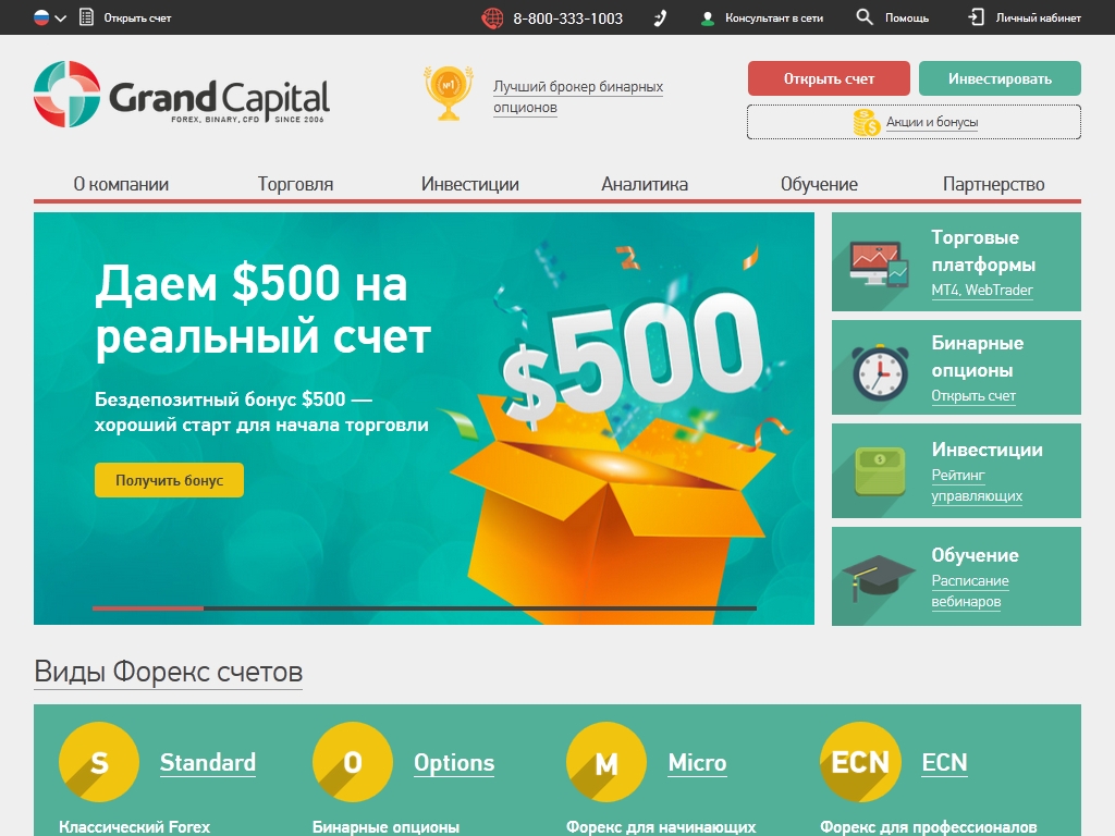 Grand Capital был основан в 2006 году, и за время своей работы показал себя только с лучшей стороны, предлагая качественные услуги на валютном рынке Forex, а также на фондовых и товарных биржах.