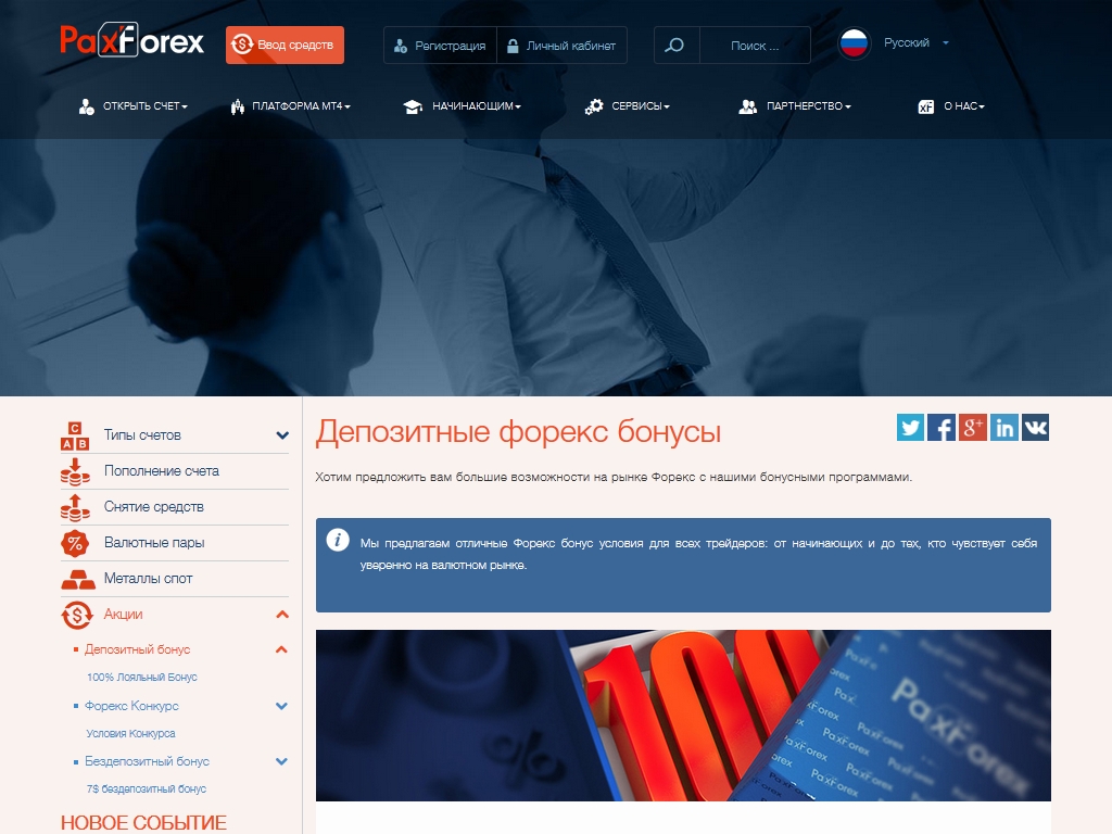 Брокер PaxForex предлагает для всех клиентов возможность получить депозитный бонус до 100%. Чтобы получить депозитный бонус нужно пополнить торговый счет, и оправить заявку на его получение сотрудникам брокера. На один торговый счет можно получить форекс бонус суммой не более 5000 долларов или 3500 евро, а по всем счетам сумма не может превышать 15000 долларов.