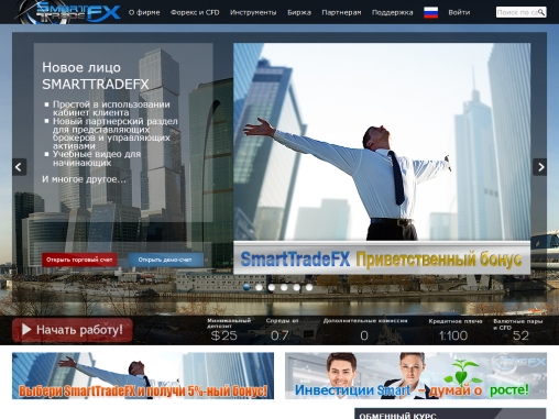 Брокер SmartTradeFX предоставляет своим клиентам отличные условия для торгов!На сайте представлен большой выбор обучающих материалов!Хорошая бонусная политика!Ввод и вывод средств можно осуществлять различными способами!