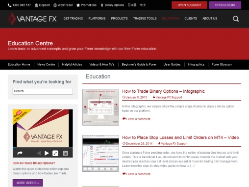 Компания Vantage FX на своем официальном сайте опубликовала большое количество материалов, которые дадут возможность трейдерам, как следует изучить валютную торговлю и торговлю бинарными опционами.