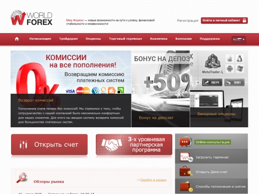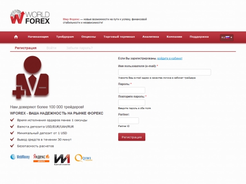 WorldForex предлагает следующие способы пополнения торговых счетов: VISA, MasterCard, Яндекс Дегьги, QIWI, Единый Кошелек, WebMoney, moneta.ru, Сбербанк Онлайн и банковские переводы.
