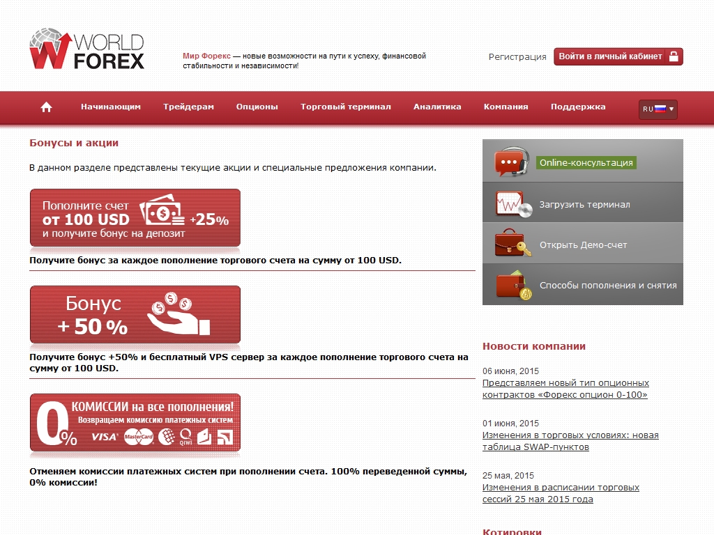 WorldForex периодически проводит различные конкурсы, участники которых могут выиграть внушительные денежные призы, а за пополнение торговых счетов все клиенты брокера получают бессрочные форекс бонусы в размере 25% от внесенной суммы.