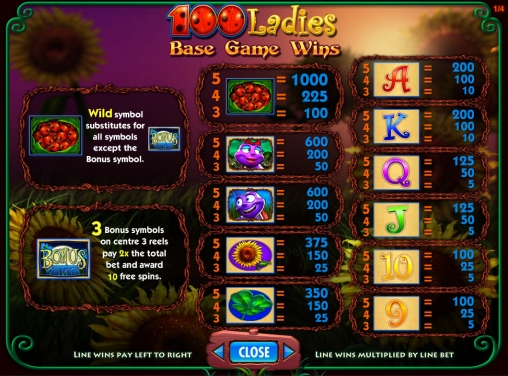 100 Ladies – 5-барабанный видео-слот с четырьмя рядами картинок на экране. Играть на игровом автомате разрешается по одной, десяти, двадцати пяти, пятидесяти, семидесяти пяти или ста активным линиям. Ставка на линию варьируется в диапазоне от одного до двадцати кредитов, а на раунд принимается до двух тысяч.