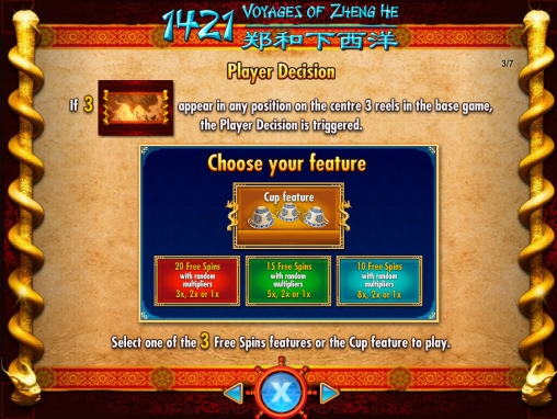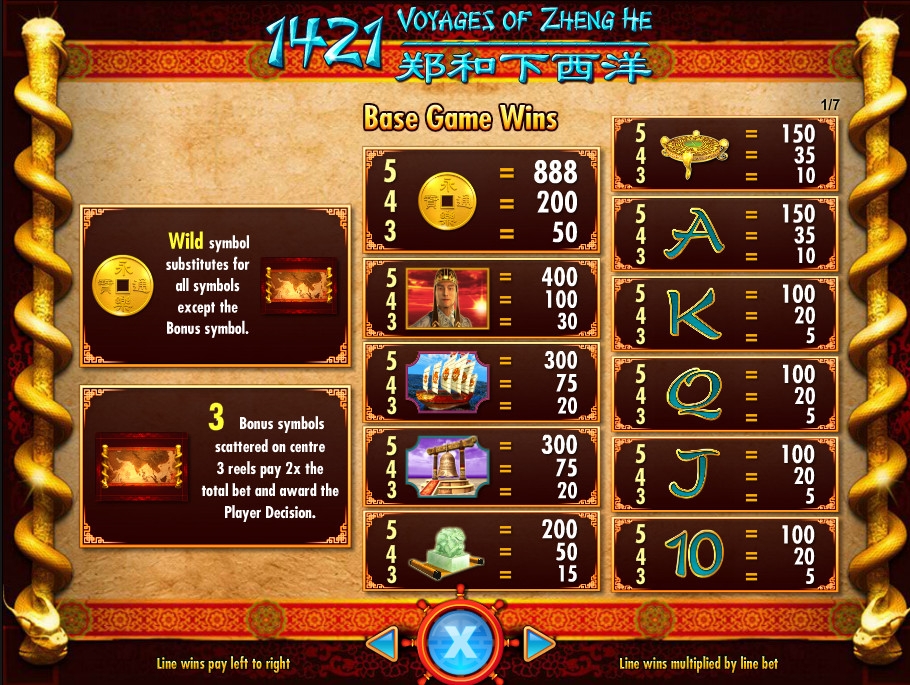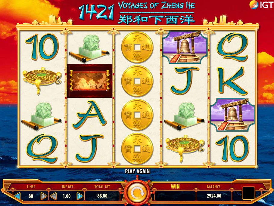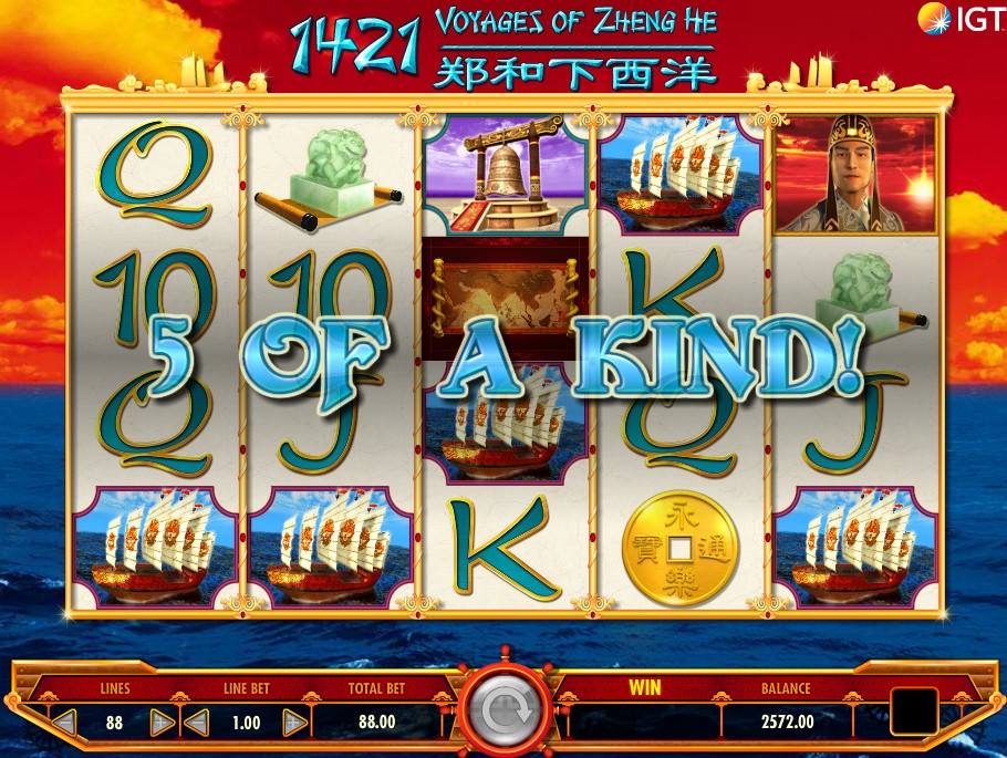 1421 Voyages of Zhang He – модель с пятью барабанами и двадцатью картинками на главном экране. Играть на аппарате можно по восьми – восьмидесяти восьми активным линиям (с шагом в двадцать полос).