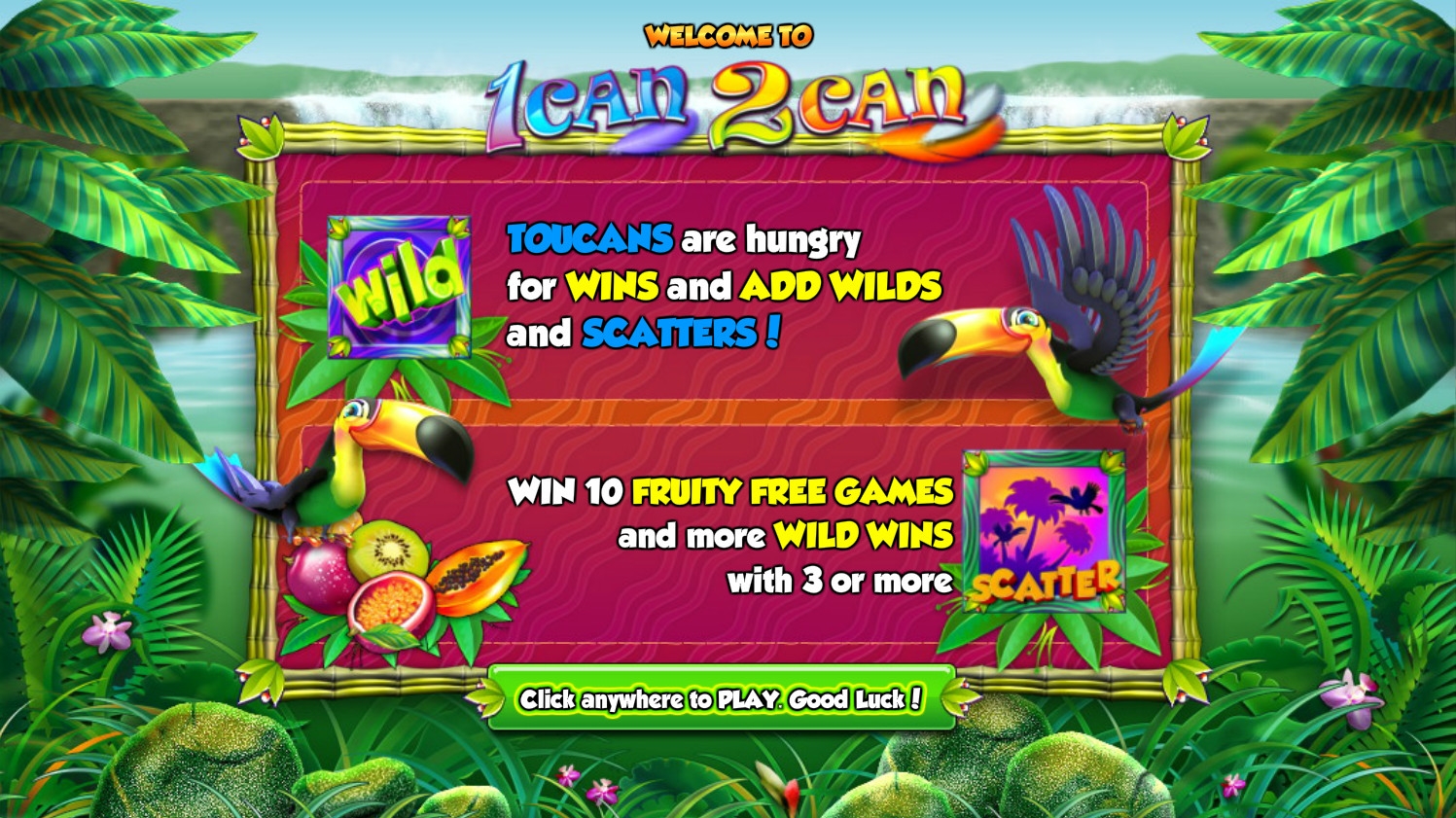 Компания NextGen Gaming предлагает вам отправиться в удивительный мир джунглей, запустив ее новый бесплатный игровой автомат 1can 2can. В его наименовании обыгрывается название вида птиц, известных как туканы. Именно они стали главными персонажами этого бесподобного 3D видео-слота с потрясающей графикой, увлекательными опциями, многочисленными комбинациями и прочими достоинствами. Мы уверены, что он понравится большинству читателей Casinoz.