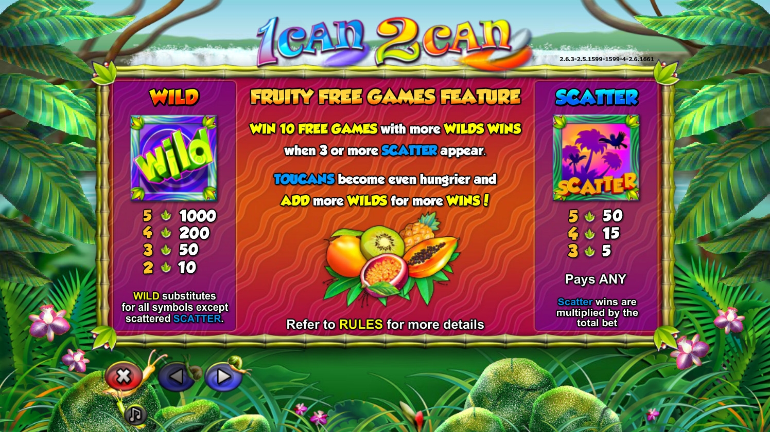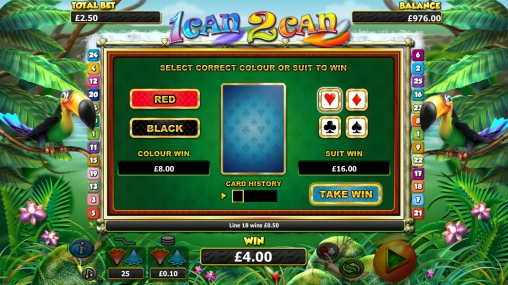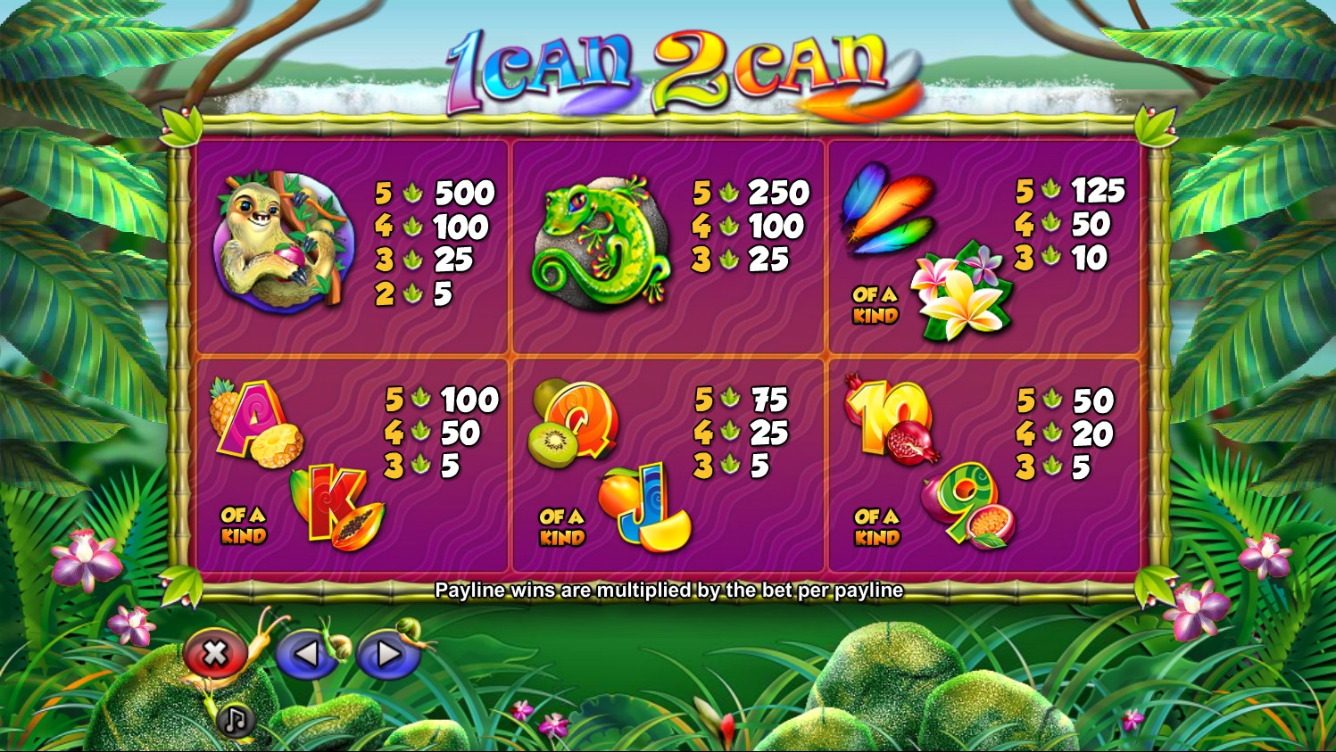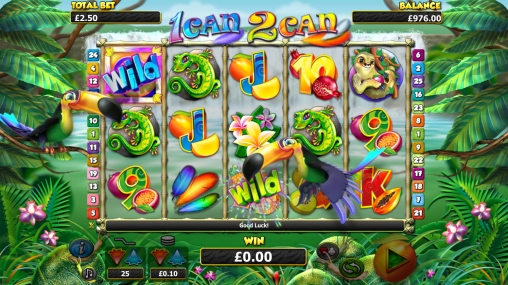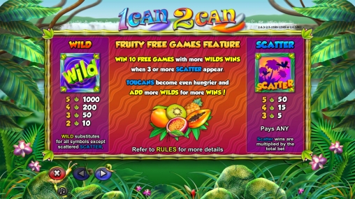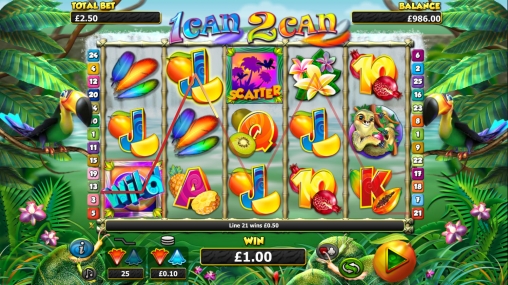 В игровом автомате 1can 2can вы увидите обитателей джунглей, цветы, перья и красочные номиналы игральных карт от девятки до туза, возле которых лежат тропические фрукты.