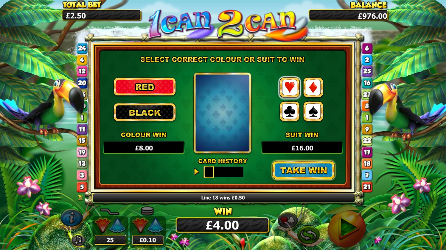Играть на игровом автомате разрешается по одной – двадцати пяти активным линиям, поставив на каждую из них 0.01, 0.02, 0.05, 0.10, 0.20, 0.25, 0.50, 1 или 2 евро. Самая крупная ставка, принимаемая на кон в 1can 2can, достигает пятидесяти евро.