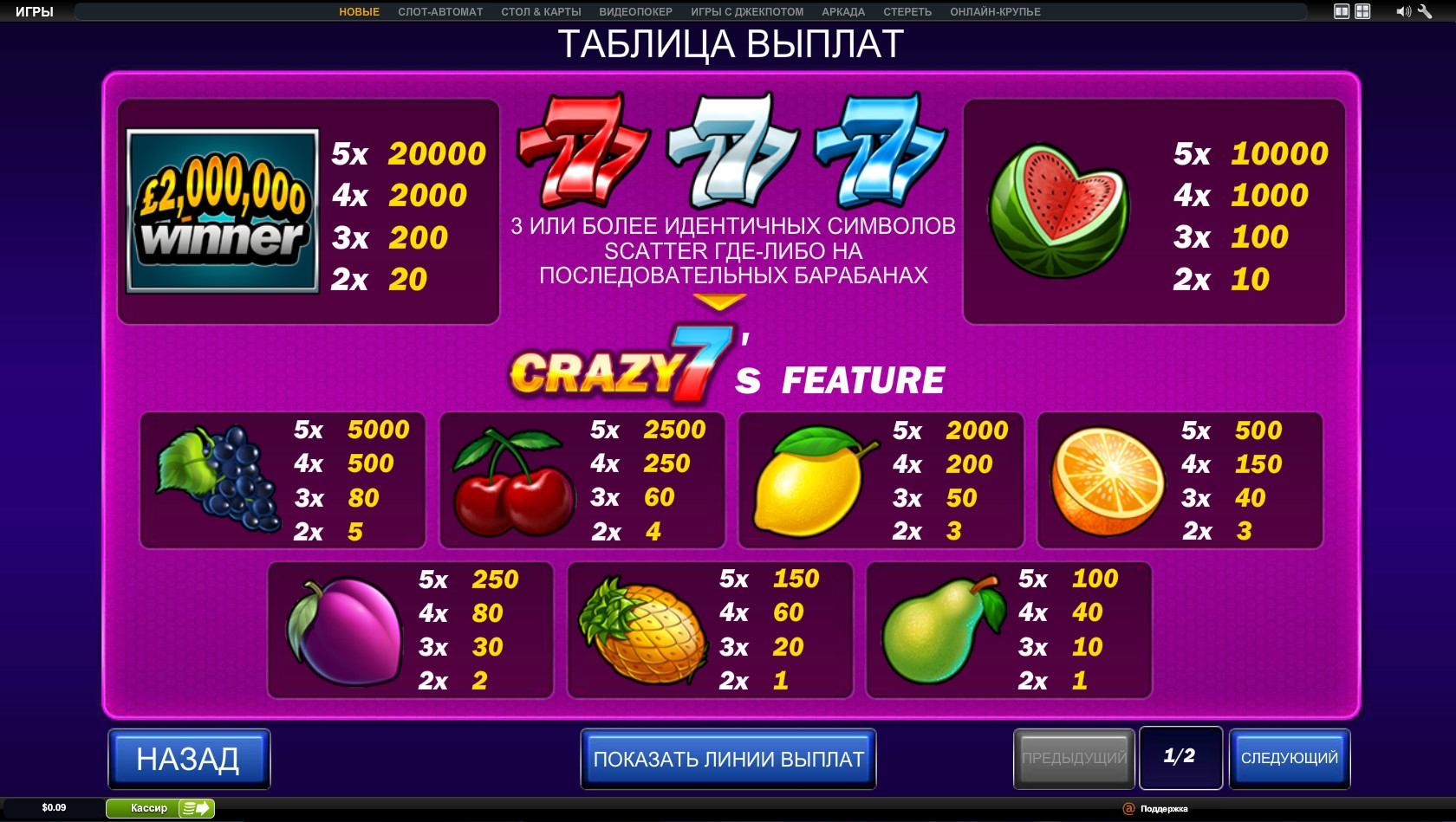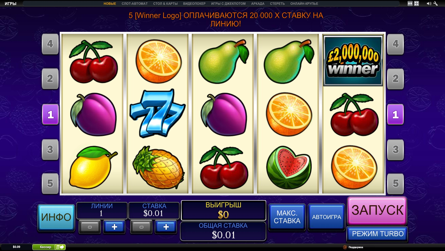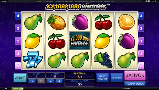 2000000 Winner -классический игровой автомат!Яркие фрукты всегда будут радовать глаз!Удобный и простой интерфейс!Хорошая бонусная игра!Вообщем автомат без заморочек!Подойдёт начинающему игроку!