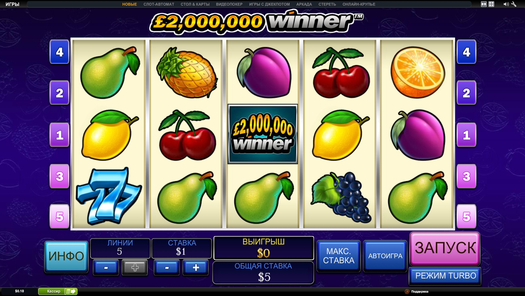 2000000 Winner представляет собой игровой автомат пятью барабанами и таким же количеством линий. При этом вы можете задействовать любое количество активных полос. Ставки по ним автоматически выравниваются. Они могут быть от одного цента до ста долларов. Получается, что на спин принимаются суммы в очень широком диапазоне: $0.01 - $500.