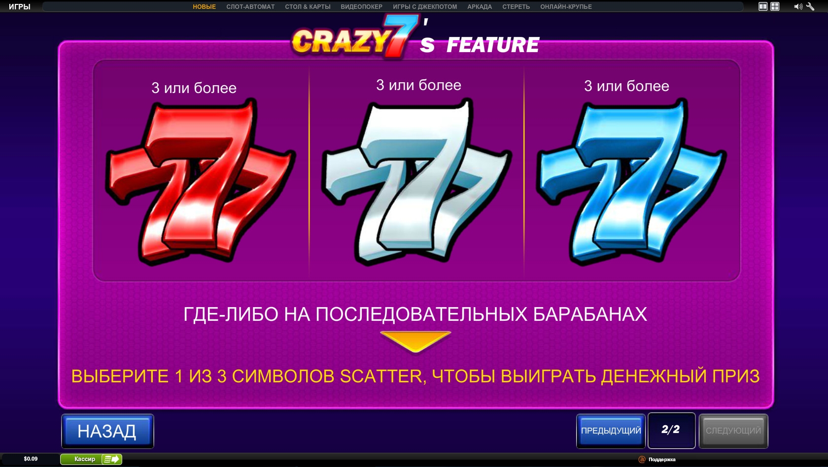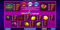 Картинки на экране располагаются в три ряда. Набор предлагаемых опций геймплея состоит из простых и специальных символов и бонусной функции Crazy 7’s.