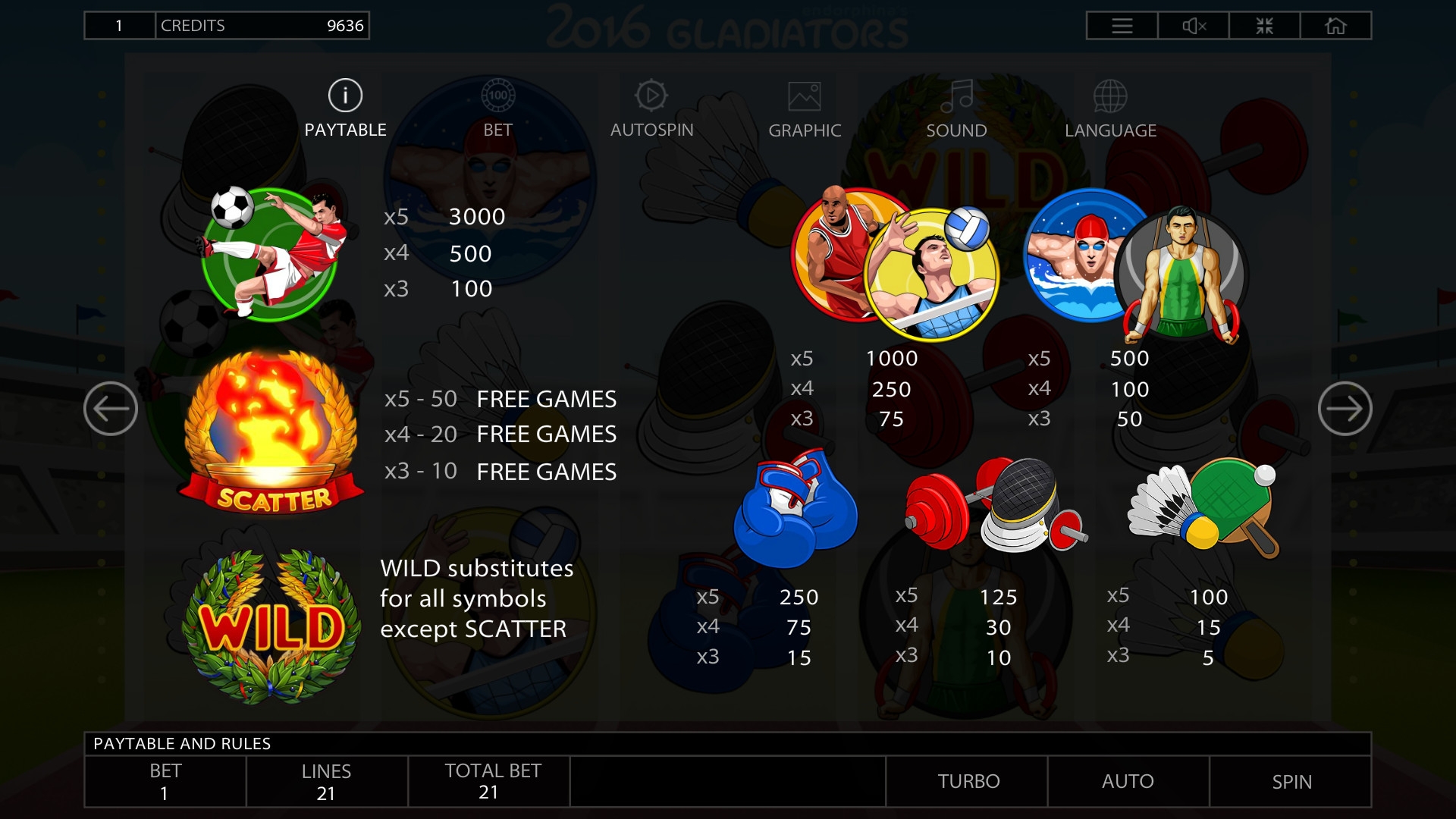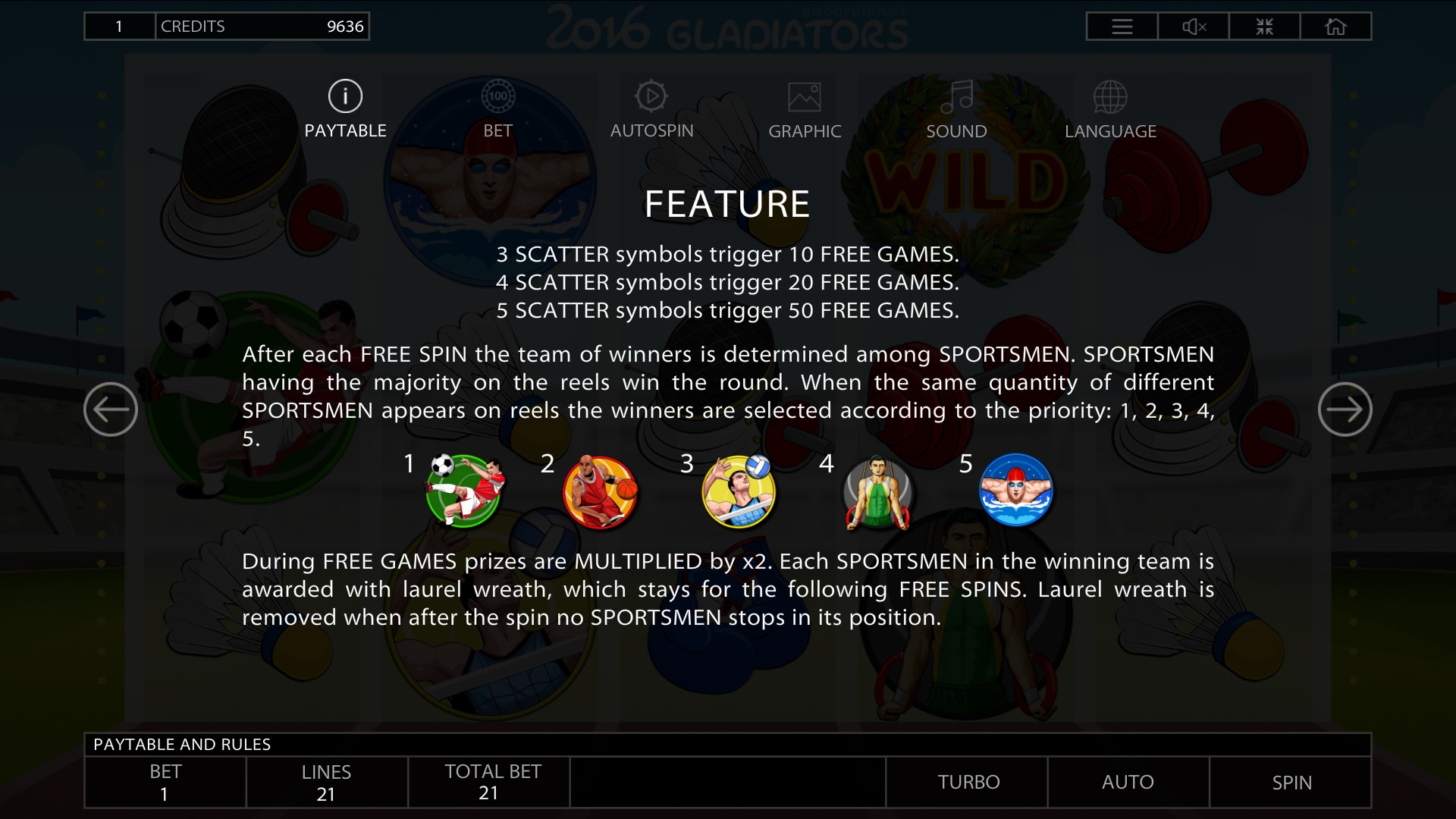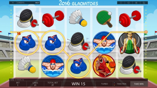 На экране слота 2016 Gladiators появляются представители разных видов спорта и элементы экипировки. Все картинки анимированы, поэтому при образовании комбинаций запускаются красочные вставки.