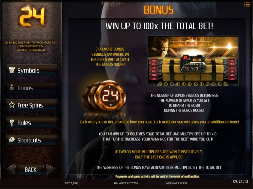 Призовой раунд выдержан в духе видео-слота. Агенту под вашим руководством предстоит обезвредить бомбу с часовым механизмом. Чем больше бонусных картинок выпало на экране, тем больше у вас будет времени на выполнение задачи. Вы будете наугад перерезать провода, получая выплаты и дополнительные секунды. Всего можно выиграть до ста общих ставок.