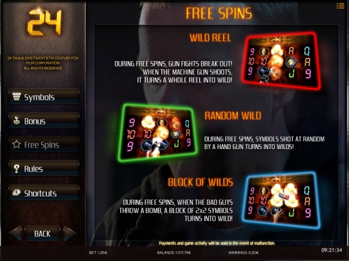 Особыми элементами являются Wild (зеленая надпись в оптическом прицеле), Scatter (жетон с надписью Free Spins) и Bonus (число 24). О них читайте далее: