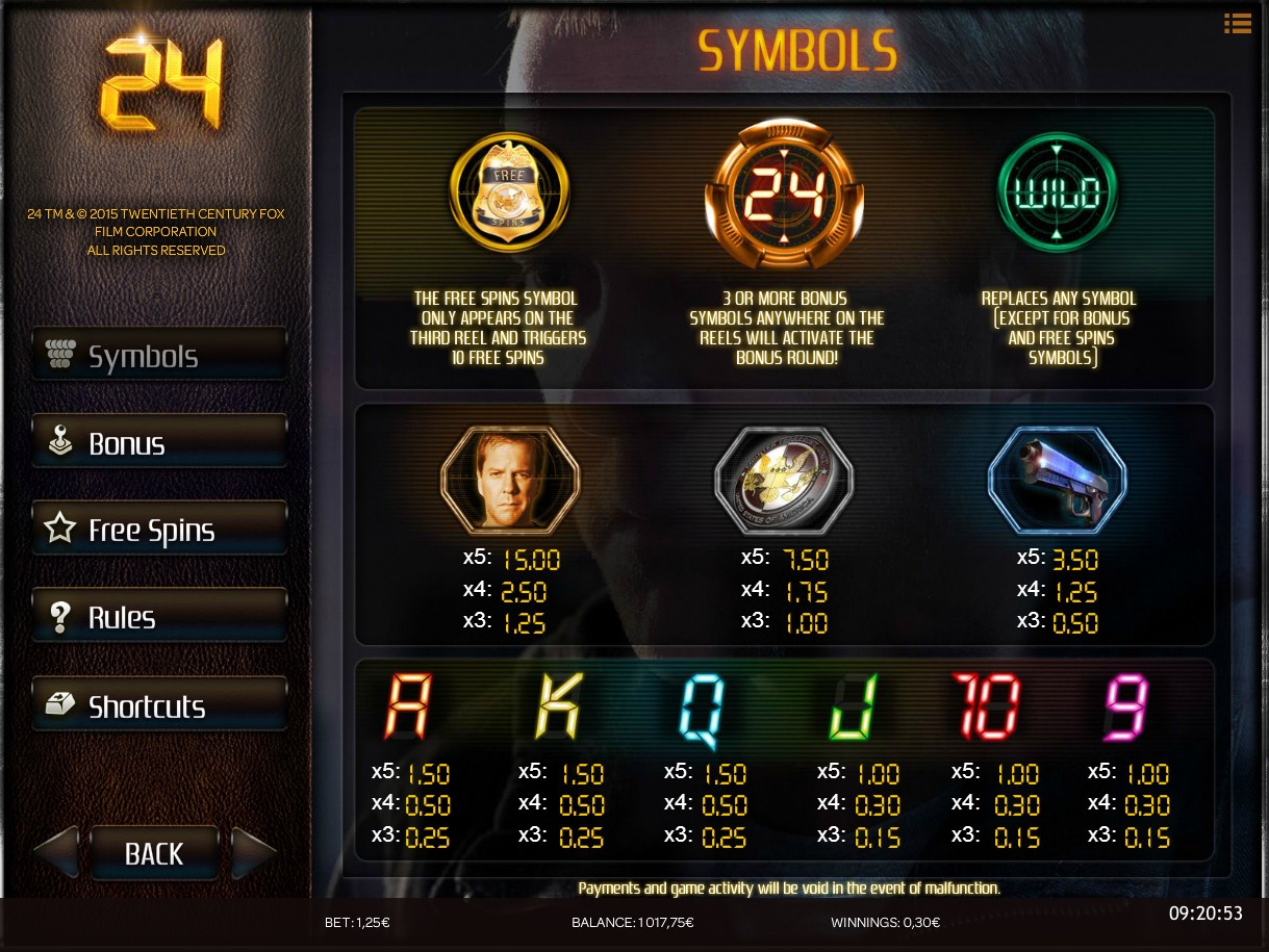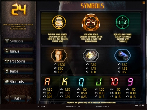 В видео-слоте 24 представлены девять обычных и три специальных картинки. Базовыми символами являются шесть номиналов игральных карт, выдержанные в стиле разноцветных чисел и букв на цифровом табло, а также главный герой сериала, его пистолет и логотип агентства, на которое он трудится.