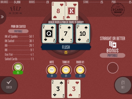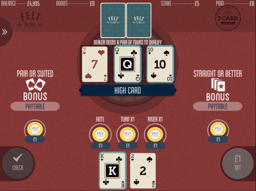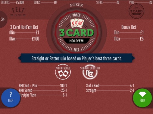 Компания FELT недавно вышла на рынок интернет-гемблинга (она даже основана была лишь в 2013 году), поэтому на данный момент ее продукцию предлагают немногие заведения. Но игры этого бренда по-настоящему качественные, и мы не сомневаемся, что вскоре они будут представлены во многих крупных онлайн-казино. Наши обозреватели тестировали 3 Card Hold’Em на портале Unibet.