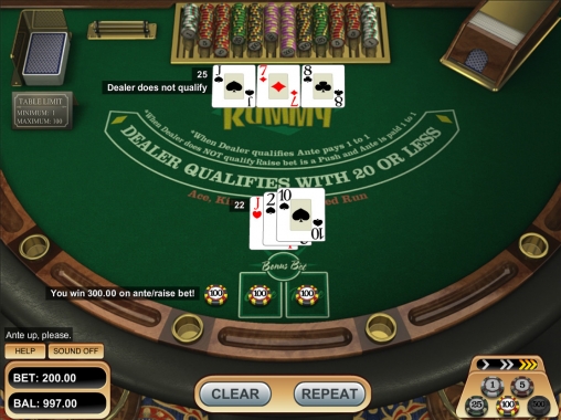 Как уже говорилось выше, помимо анте, в 3-карточном рамми можно делать побочную ставку. Она принимается на специальное поле, отмеченное надписью Bonus Bet. Ставка оплачивается, если в картах игрока образуется одна из следующих комбинаций (с указанием коэффициентов):