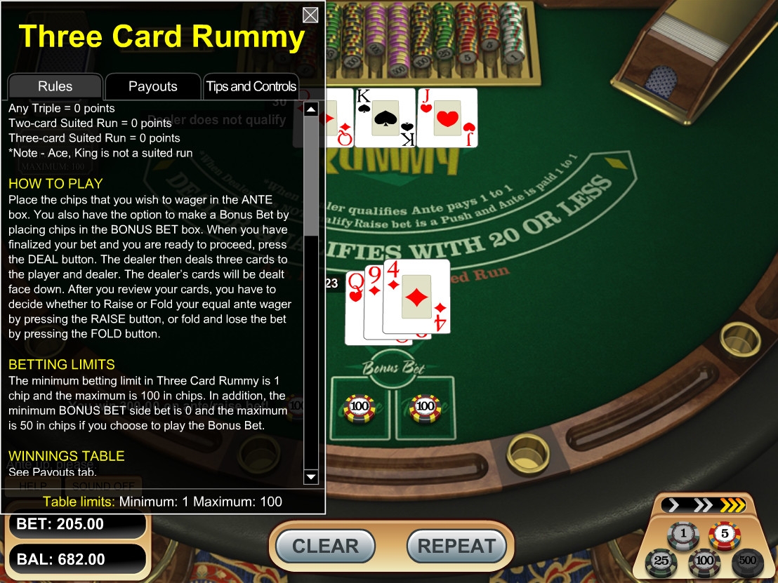 В 3 Card Rummy используется стандартная колода из пятидесяти двух карт без джокеров. Виртуальный дилер в обязательном порядке перемешивает их в начале каждой раздачи.