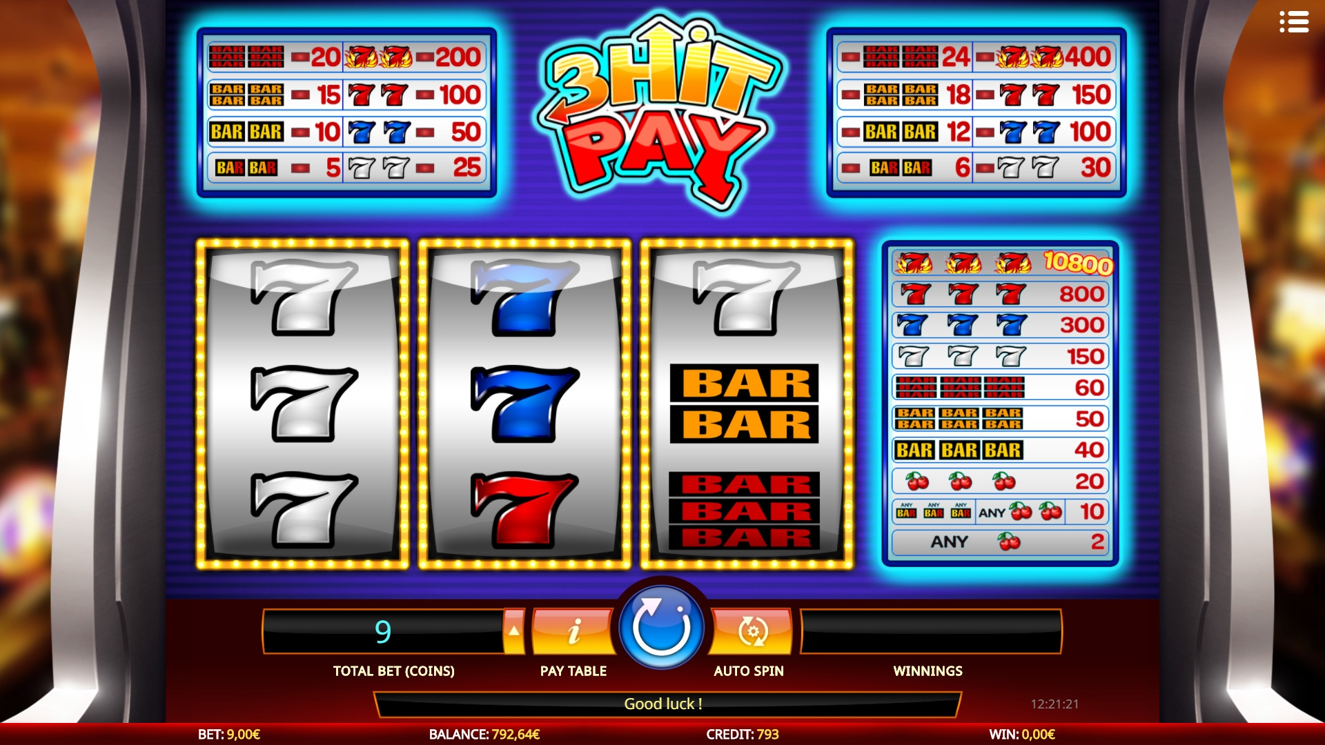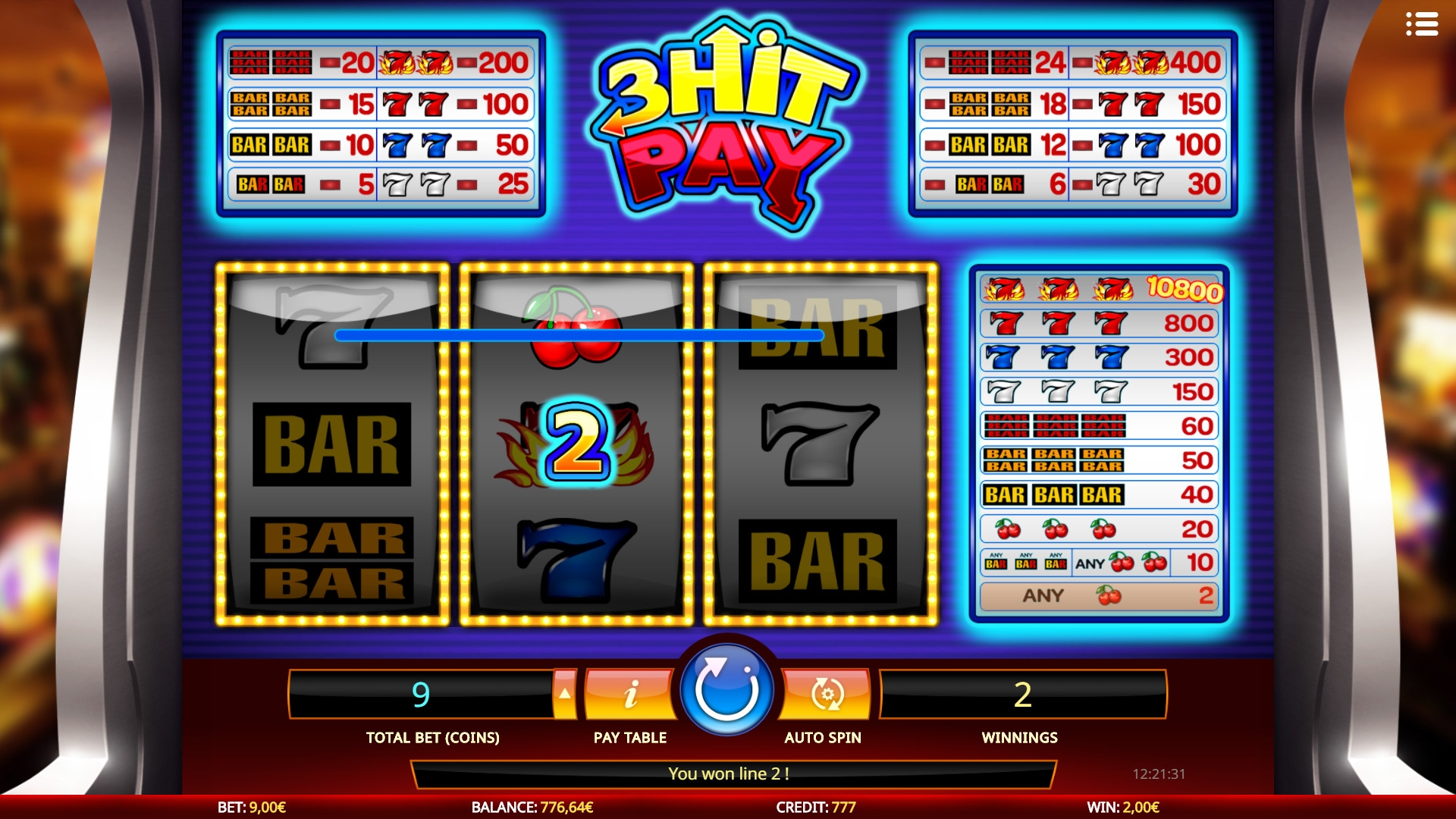 игровом автомате 3 Hit Pay три барабана, три фиксированных полосы и девять ячеек для иконок на основном экране.