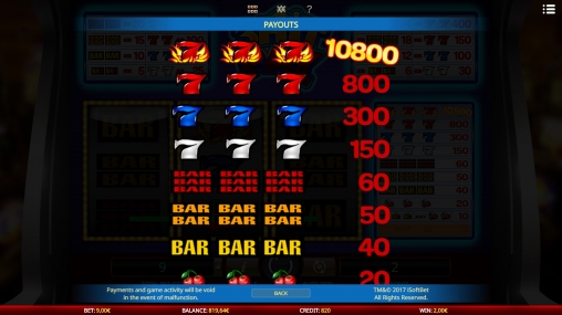 Создатели игры представили на барабанах семерки трех цветов, пылающую семерку, а также одну, две и три полоски BAR. Эти картинки могут составлять цепочки из двух или трех элементов, выстраиваясь где угодно на полосе. Наибольшую ценность представляет красная 7 в языках пламени.