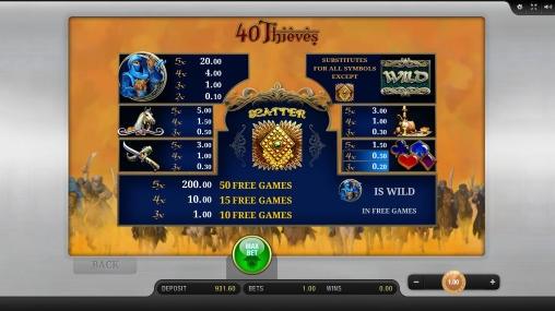 «Сорок разбойников» - это 5-барабанный игровой автомат, в котором принимаются ставки лишь на сорок (что логично!) активных полос, предназначенных для формирования на них оплачиваемых комбинаций. На экране одновременно появляются сорок элементов (5х4).