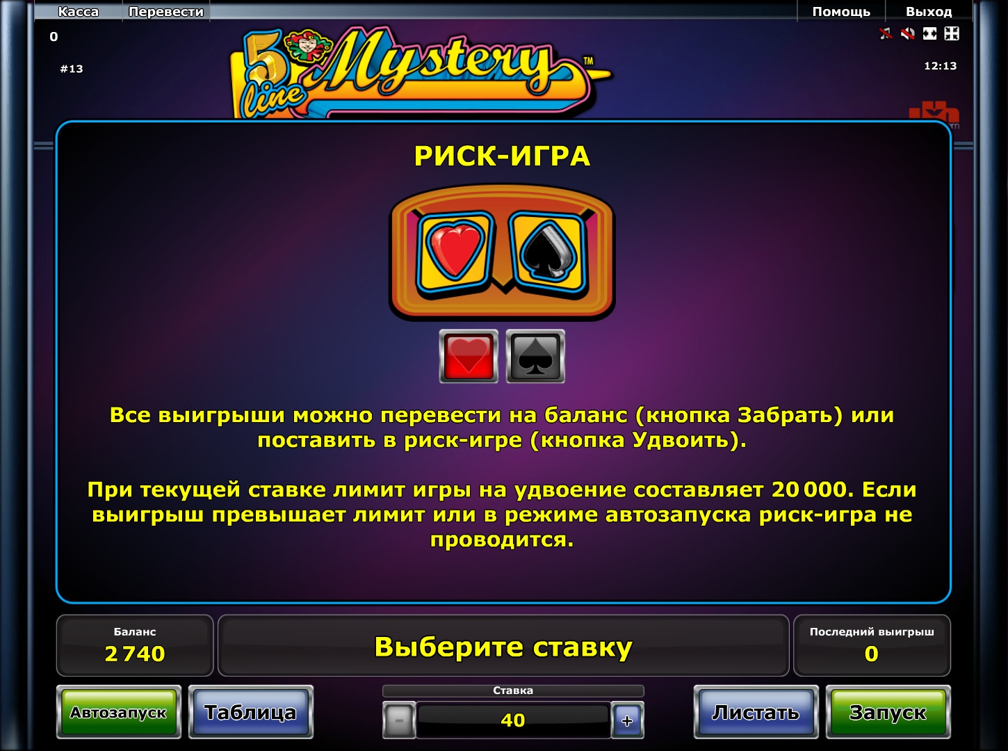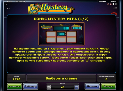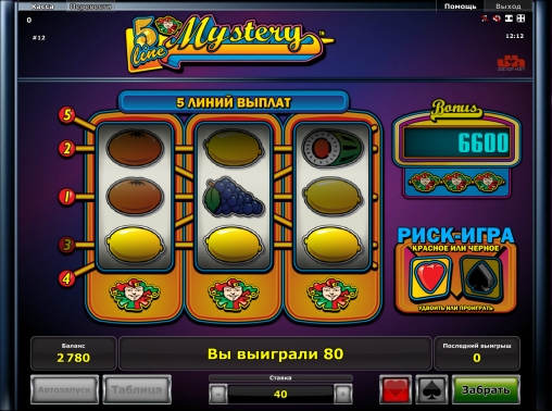 В 5 Line Mystery есть игра по равным шансам. После любого спина, принесшего выплату, вы можете наугад нажать на кнопку с изображением красной или черной карточной масти. Если вам повезет, выигрыш удвоится. Если удача не будет вам благоволить, вы лишитесь денег. Разрешается действовать несколько раз подряд. Максимум равен пятистам общим ставкам из последнего спина.